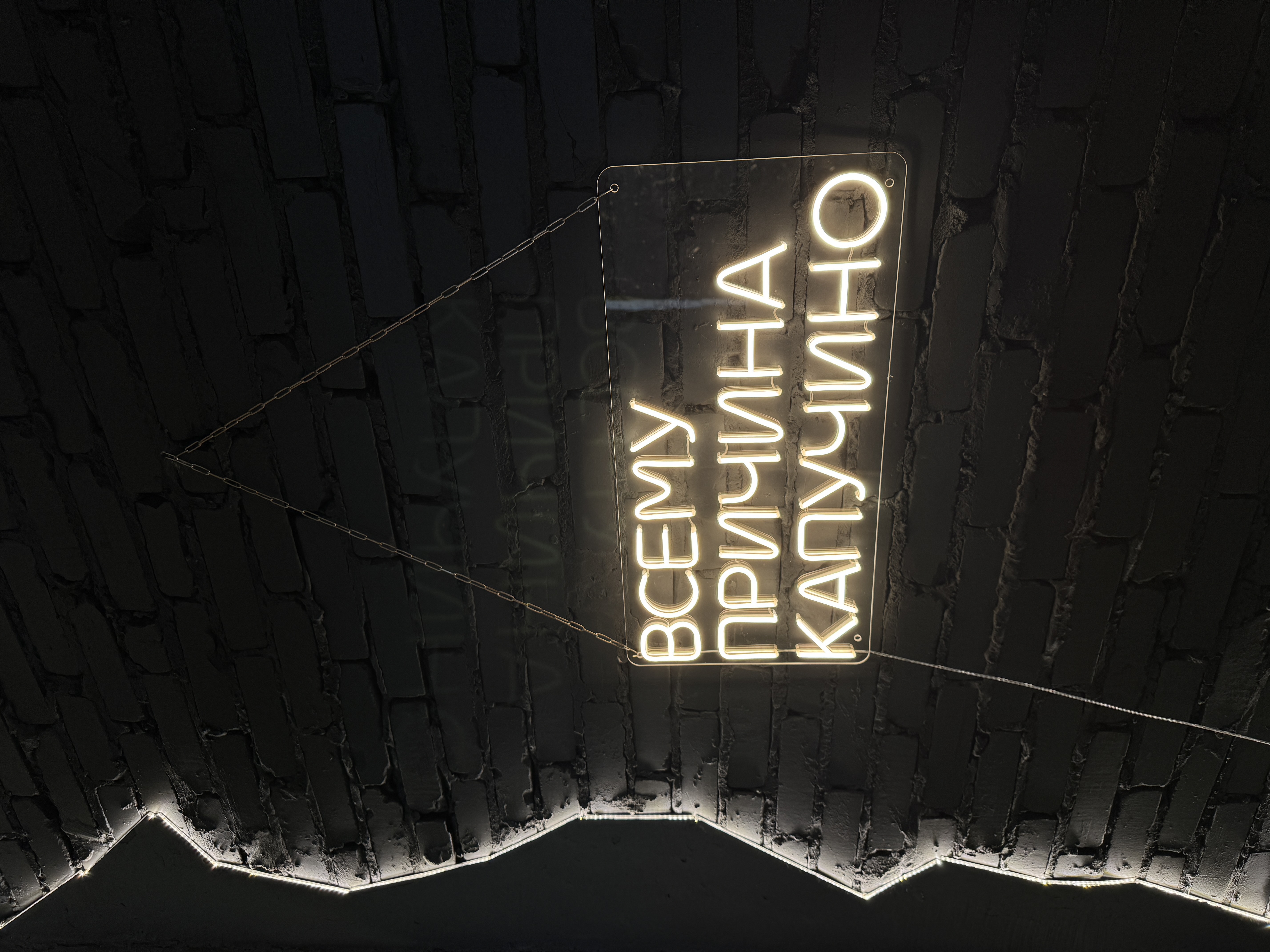 Неоновая надпись "счастье нельзя купить, но можно купить капучино"