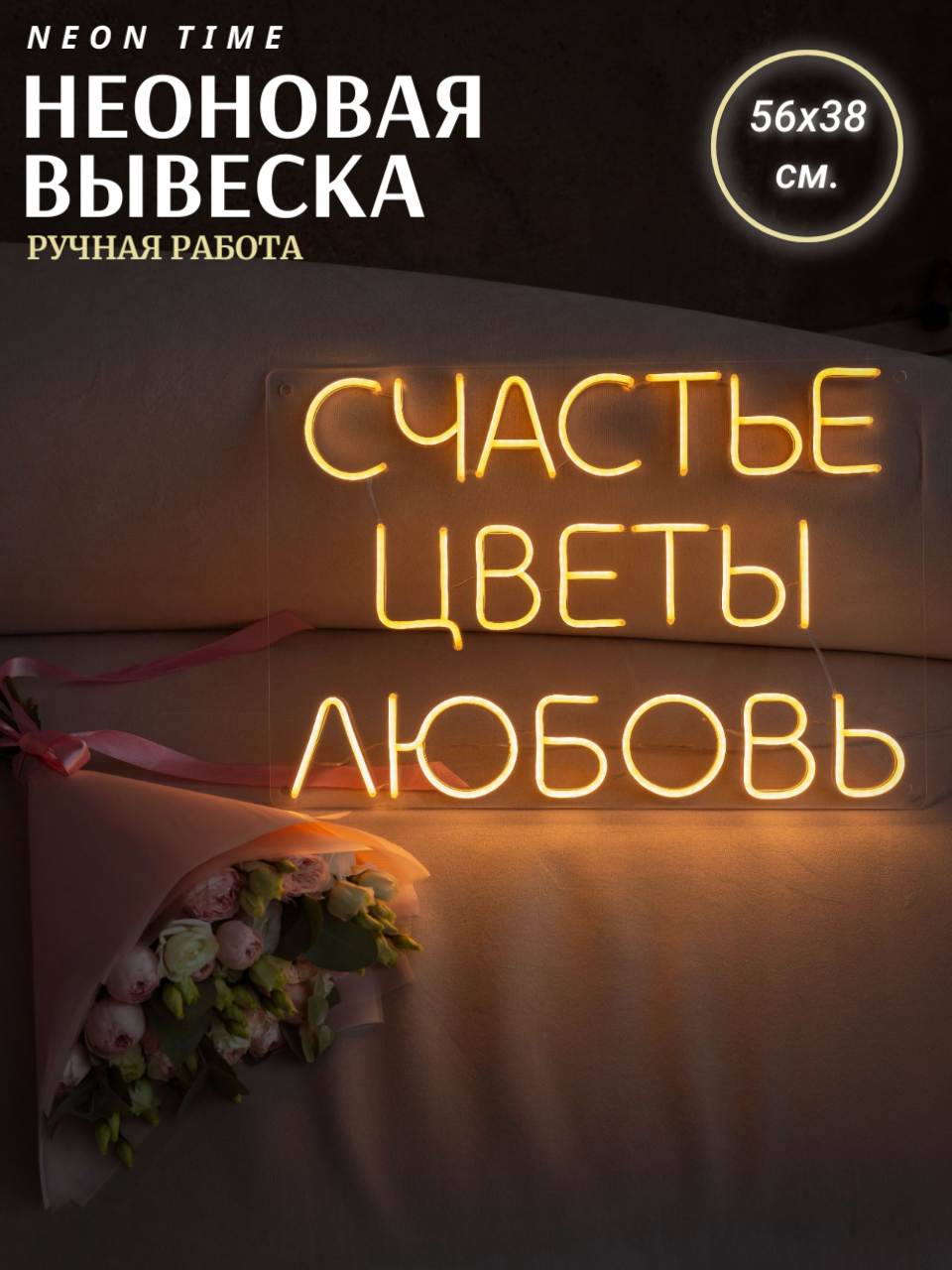 Неоновая вывеска "счастье цветы любовь"